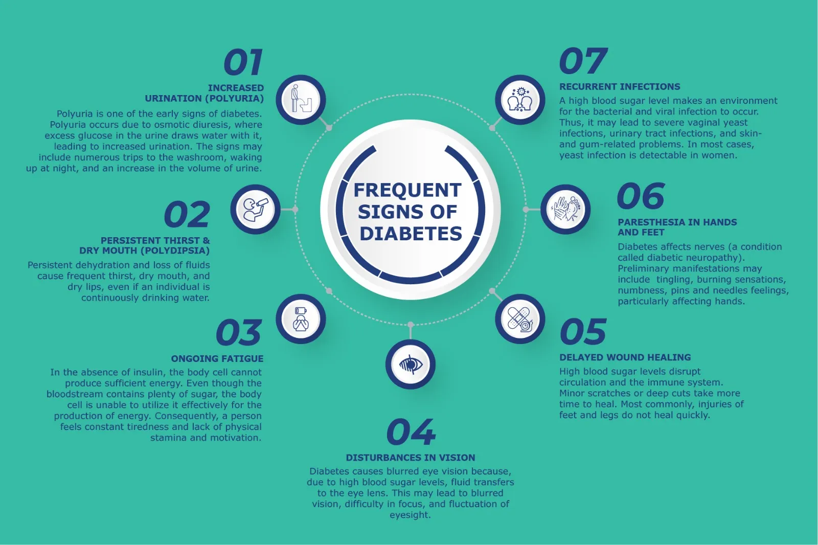 Common symptoms of diabetes are widely recognized by global health organizations. Initially, the symptoms begin after the blood glucose level becomes high and affects some parts of the body.